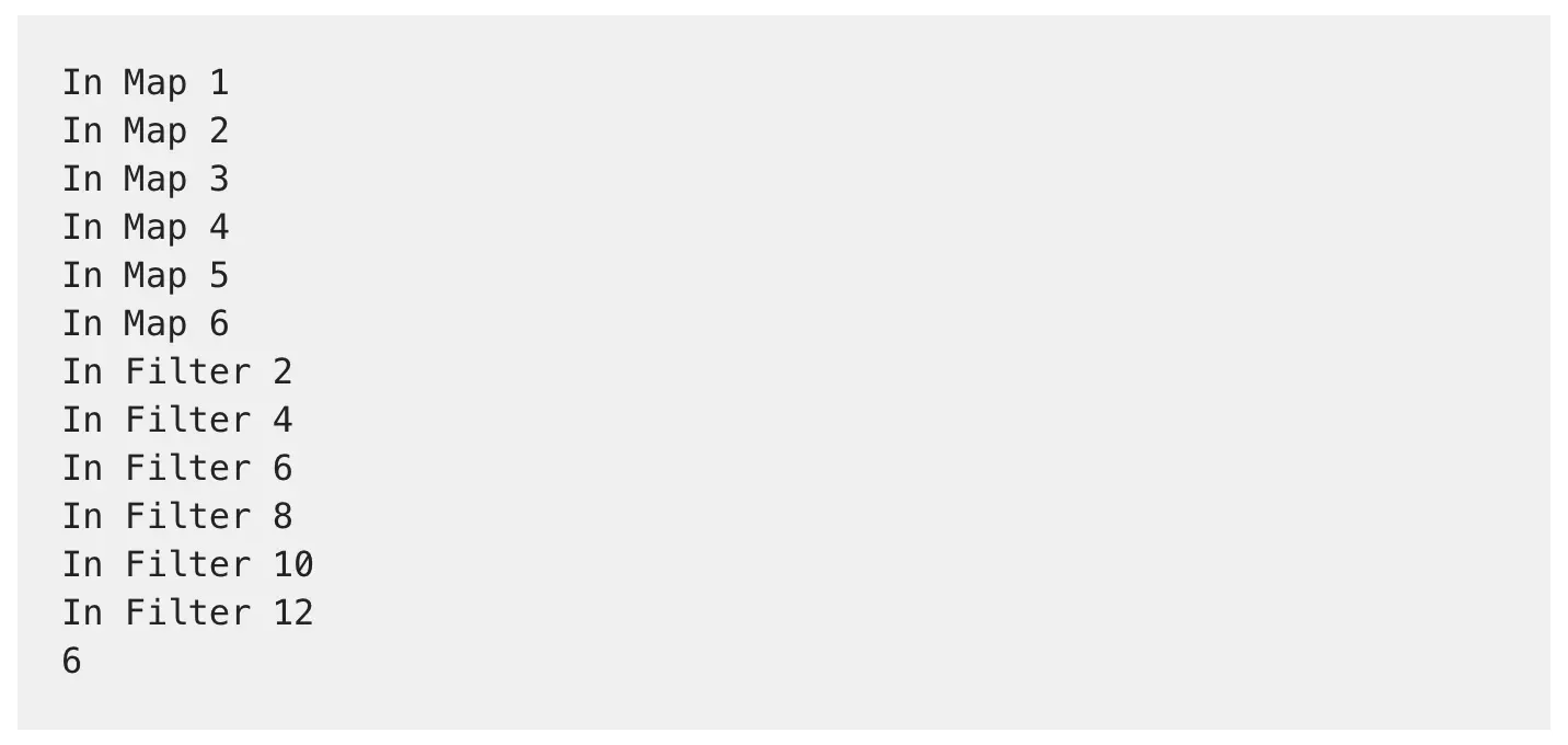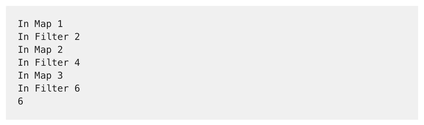 我们不要只盯着懒加载,不知道有没有注意到它在In Map和In Filter中交错执行。 这意味着,它并非是先遍历执行完第一个集合然后再遍历执行完第二个集合。而是把多个遍历操作,打成一条链,遍历这个链…可能不好理解,咱们上个图: