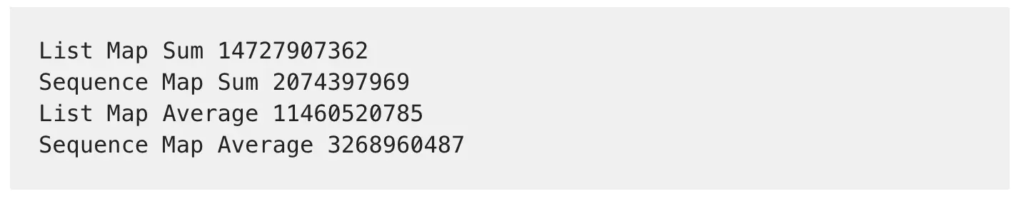+ measureNanoTime { sequence.map { it * 2 }.sum() })
