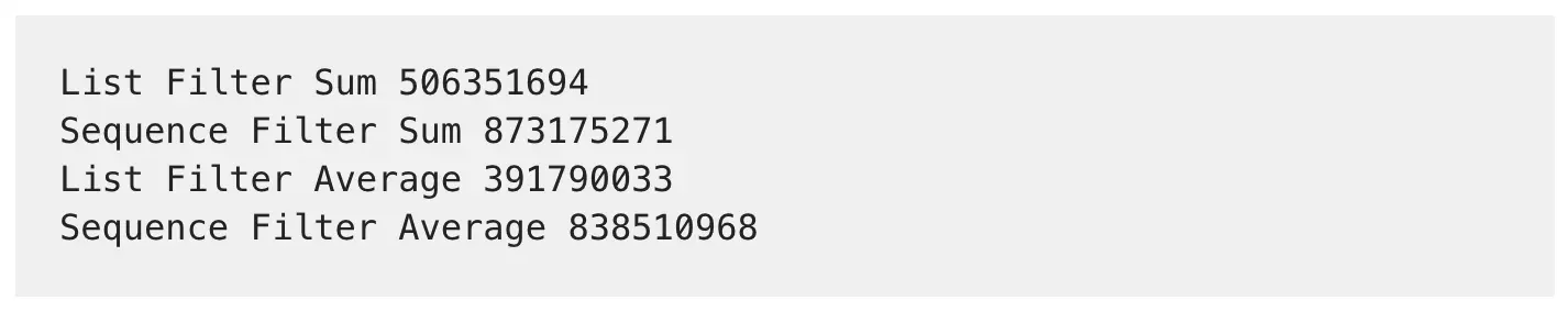 + measureNanoTime { sequence.filter { it % 3 == 0 }.average() })