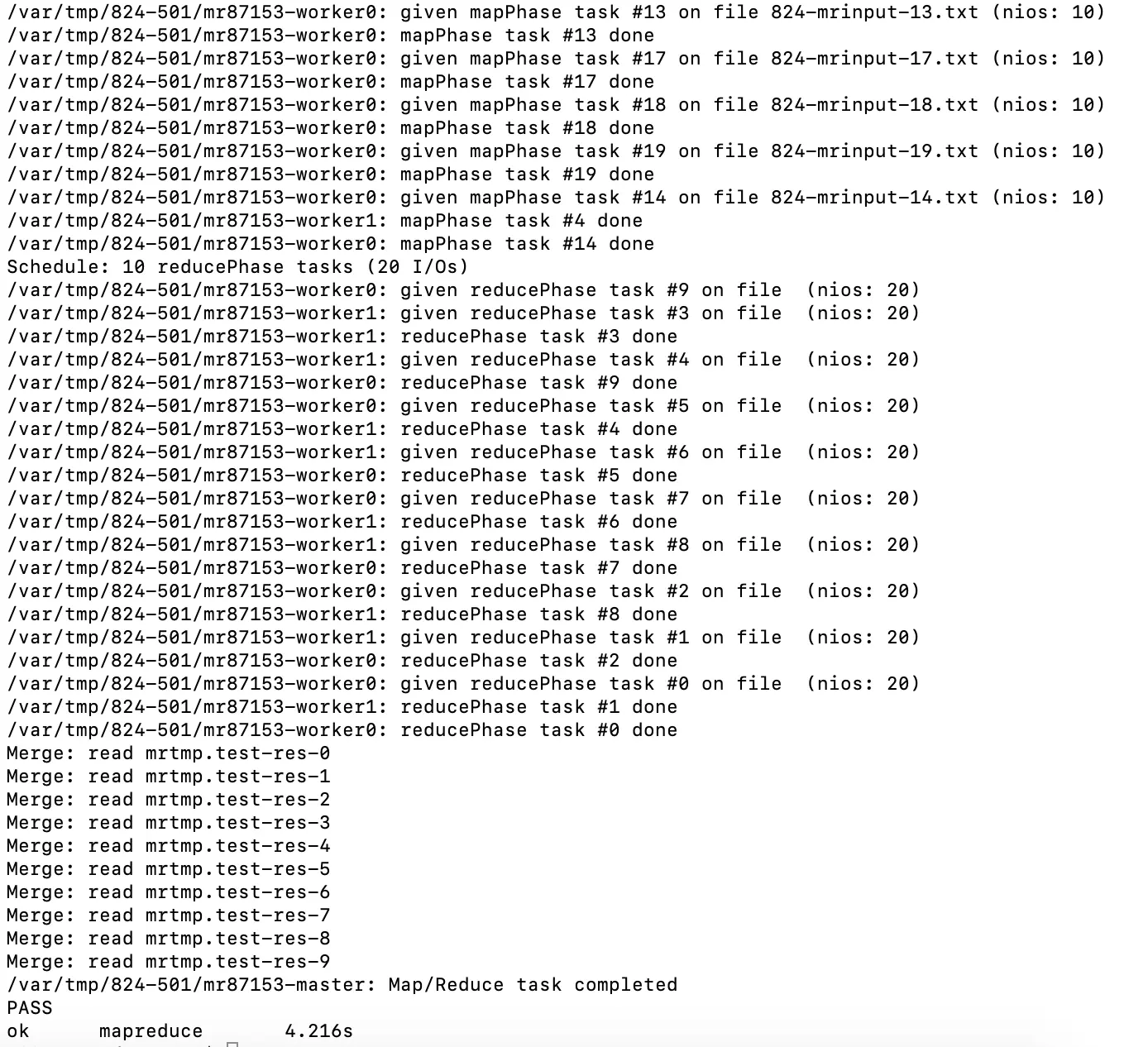 这个实验将执行两个测试,TestParallelBasic(验证运行是否正确)和TestParallelCheck(验证是否并发执行) 。在TestParallelBasic中首先会生成20个824-mrinput-xx.txt的输入文件,接着调用Distributed()函数,启动schedule(),运行map tasks和reduce tasks,然后新开两个协程去启动两个workers。最后检查生成的输出文件是否正确,每个worker至少执行了一个task。因此map tasks数量为20,reduce tasks数量为10,workers数量为2。