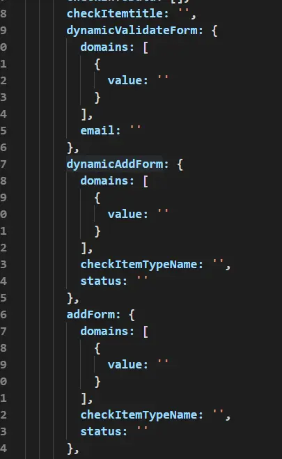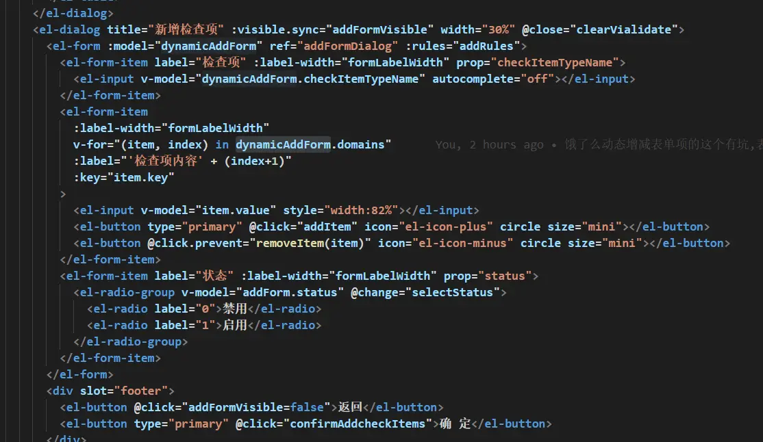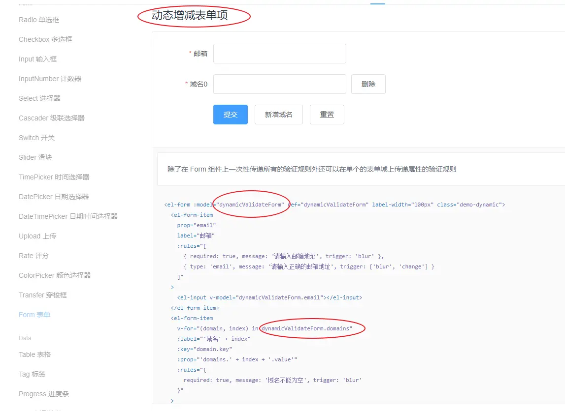 在这个表格的数据:model="dynamicValidateForm"和<el-form-item v-for="(domain, index) in dynamicValidateForm.domains" :label="'域名' + index" :key="domain.key"></el-form-item>这个:model绑定的值命名有规定(但是饿了么UI并没有给我们提示!),前面必须带着dynamic,否则页面没有想要的DOM结构!