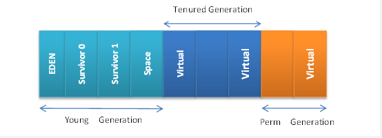 Java堆分布如下图所示,新的类的实例大部分在Eden(之所以用Eden这个词也就是表示初创起始的意思)区分配。 Eden区满的时候,或者需要GC时,依然存活的对象将被复制到Survivor区,一共有两个survivor区,当一个survivor区满时,依然存活的对象将被复制到另一个survivor区。 当survivor区全满时,从第一个survivor区复制过来的,且此时还存活的对象将被复制到Tenured Generation(年老代) Perm Generation用于存放静态文件,持久代大小可以通过MaxPermSize进行设置。