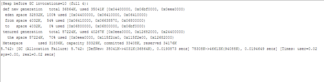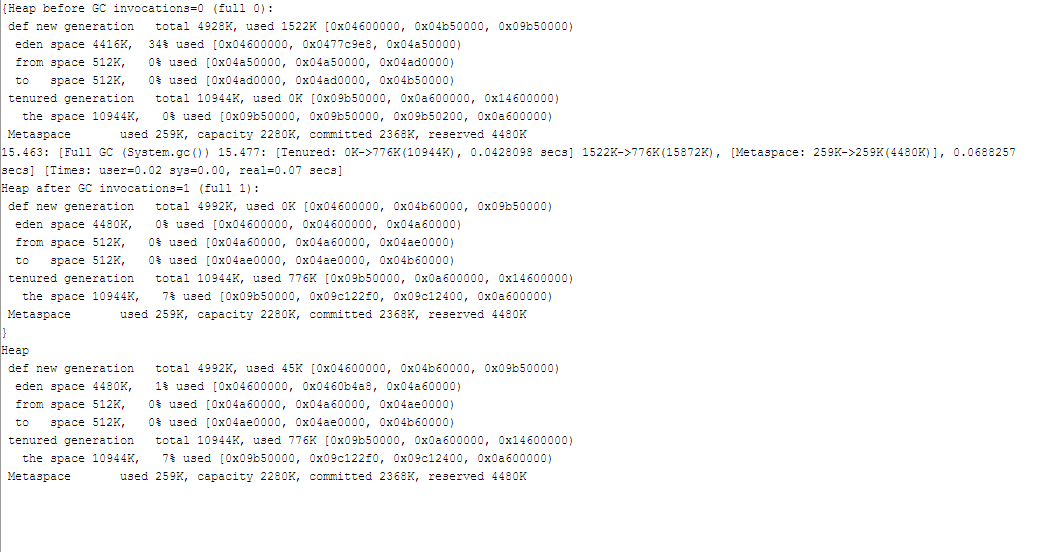 编写了一个简单的递归计算Fibbonaccy数列的程序,并在最后增加了一句System.gc()强制进行Full GC,得到的GC日志如下,回收后Eden区使用量为0。当服务器型的应用运行起来时,免不了会有多次GC,通过GC日志可以比较容易定位性能问题,比如full gc次数过多等。