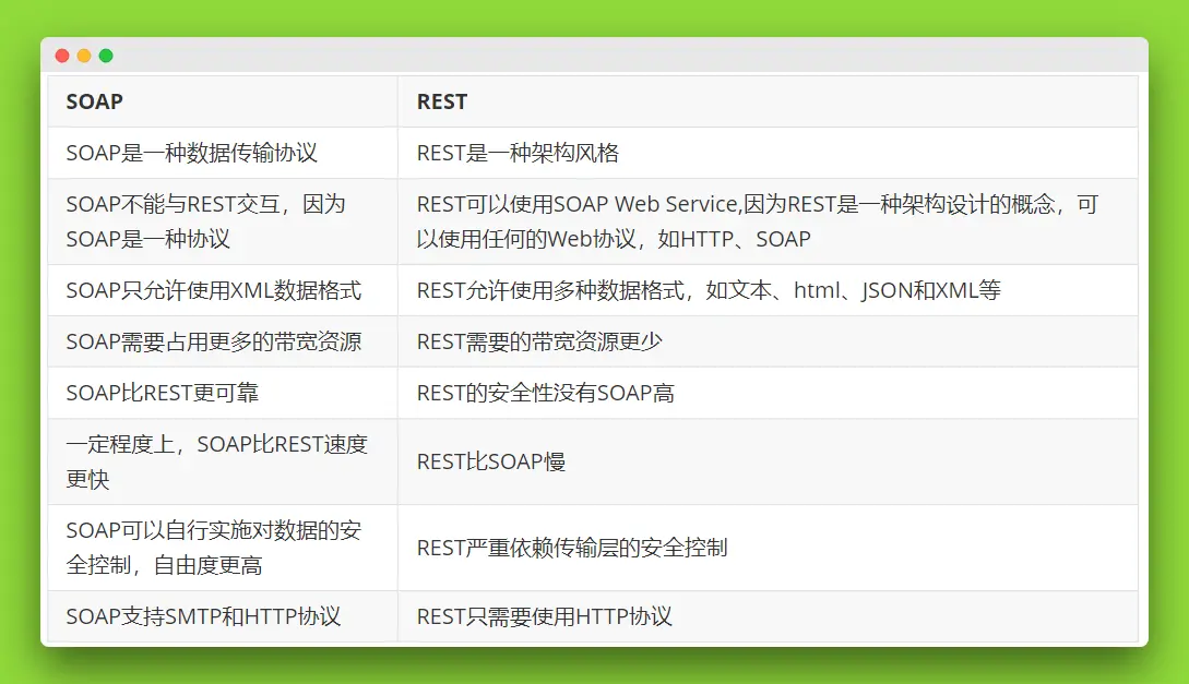 下面,通过一张表格来对比REST与SOAP之间的异同: