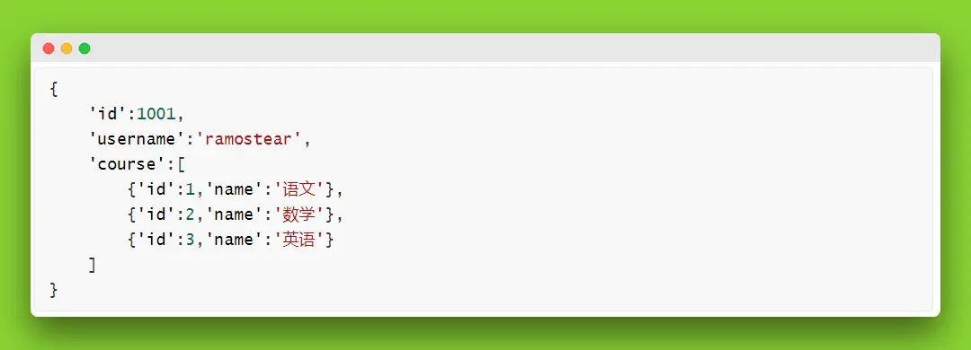 下面是一个具体的小例子,以学生管理为例,设计学生管理的API。学生资源包括ID,姓名和所学课程信息,学生资源信息如下: