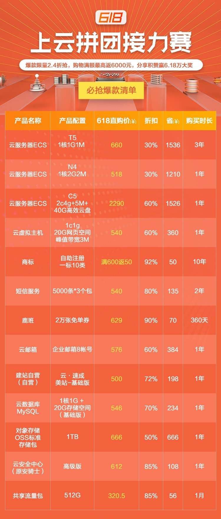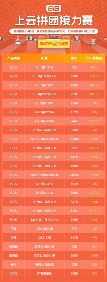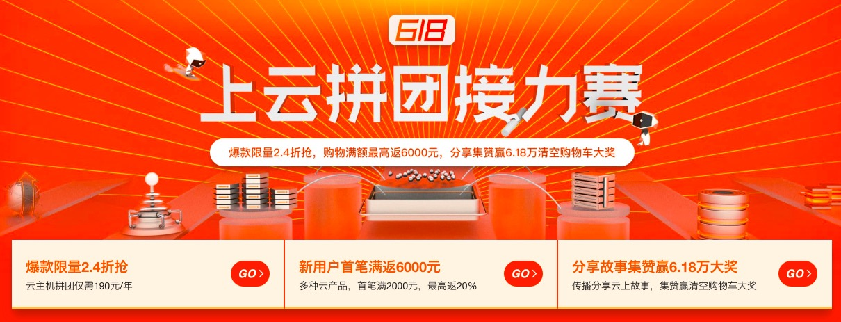 2019阿里云618大促活动已经于6月16日正式开启,从已开放的活动页面来看,整场大促活动由爆款拼团、满额最高返6000、上云接力赛分享集赞赢6.18万大奖三大活动组成。