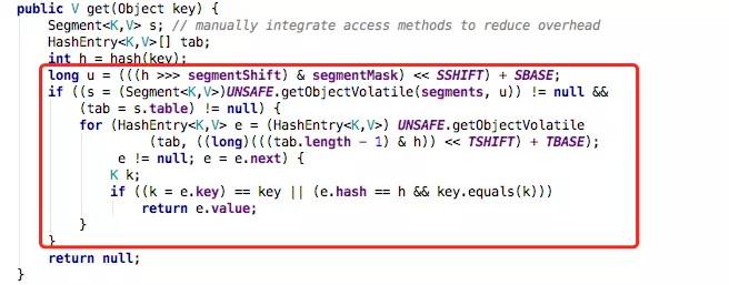 - 根据步骤1计算出的hashCode定位segment,如果segment不为null && segment.table也不为null,跳转到步骤3,否则,返回null,该key所对应的value不存在;