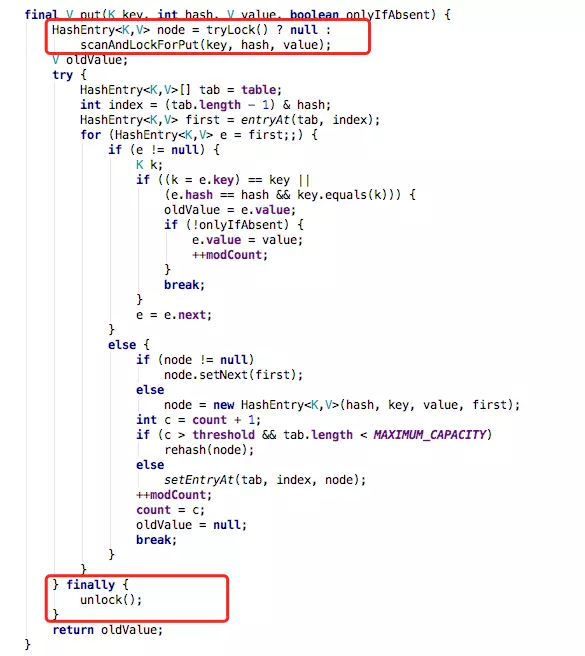 6. 其余情况把新的Node节点按链表或红黑树的方式插入到合适的位置,这个过程采用同步内置锁实现并发,代码如上。