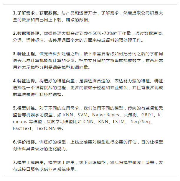 我们先来用一个小型NLP项目流程来举例,让大家了解机器学习项目的大的环境: