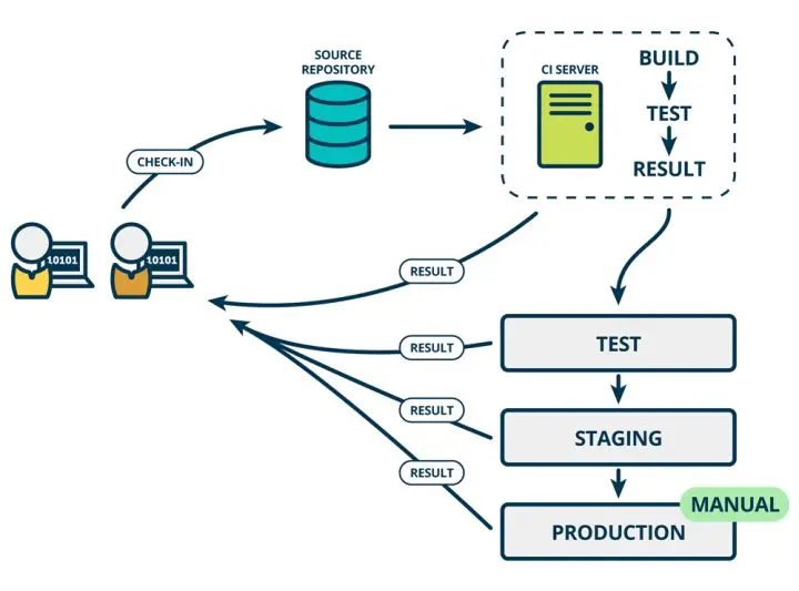 从频繁提交代码、自动化测试(保证测试覆盖) -> 运行本地测试 -> 服务器运行测试 -> 部署到测试环境 -> 交付管理