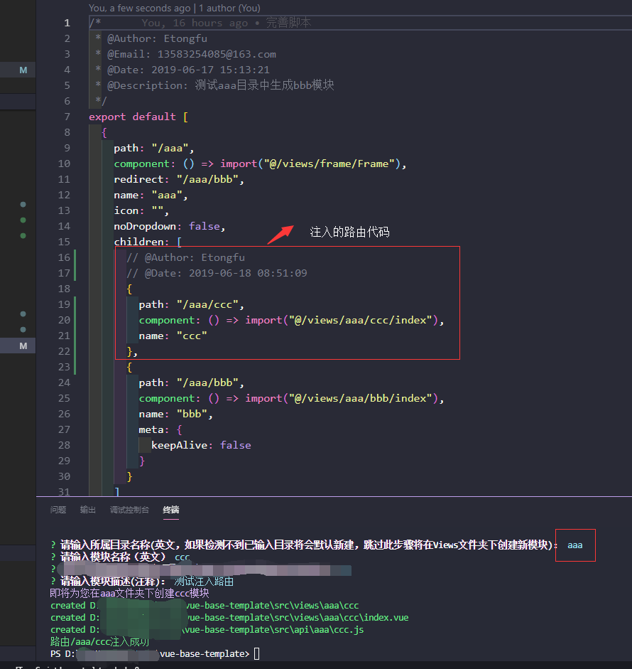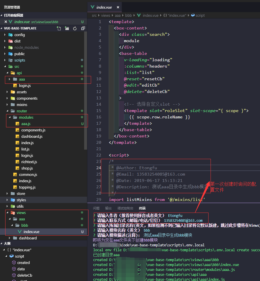 build-module.js: 入口文件, 与使用者进行交互的脚本。 通过问答的方式得到我们需要的三个核心变量目录(抽象模块), 模块(具体模块), 注释。如果是第一次执行这个脚本, 那么还会有配置相关的问题, 第一次设置完之后接下来的使用将不会再询问,若想修改可自己修改.env.local文件。这里我不详细描述了, 大部分解释都写在注释里面了。