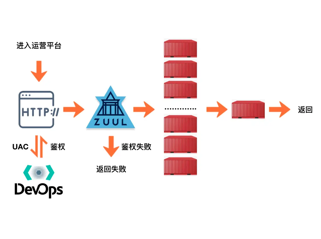 首先进入系统之后会先进入一个统一鉴权的系统去鉴权,鉴权成功之后就会到我们的微服务网关,如果这个地方还有系统自己的特殊鉴权的话,再次进行鉴权。之后网关这边会将我们的请求根据配置的路由来分发到具体的某个服务器上的某个容器中。