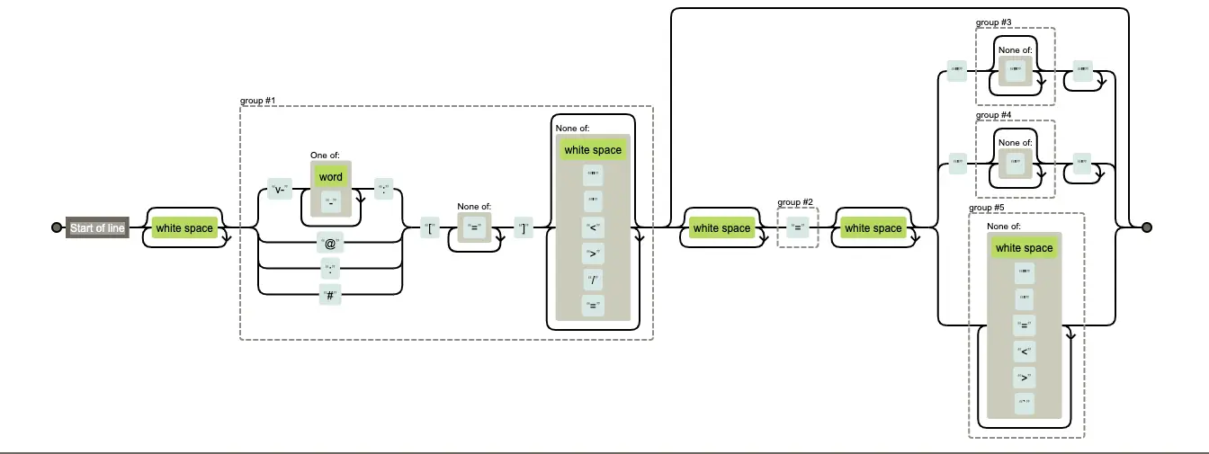 const dynamicArgAttribute = /^\s*((?:v-[\w-]+:|@|:|#)\[[^=]+\][^\s"'<>\/=]*)(?:\s*(=)\s*(?:"([^"]*)"+|'([^']*)'+|([^\s"'=<>`]+)))?/ // 重要二
