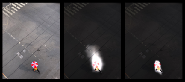 实际上,基于注意力的 Saliency 会更为复杂。其实我们也能直观地感受到,因为注意力本身就会受到太多人为的不确定因素的影响,比如画面对比度、人物面部、画面主题、视野范围、光线强度等。有意思的是,它甚至会被持续的运动状态所影响,比如下图中,基于注意力的 Saliency 将人物行进路线前方的部分区域也进行了高亮: