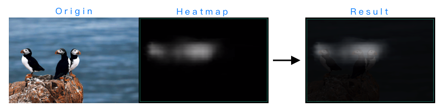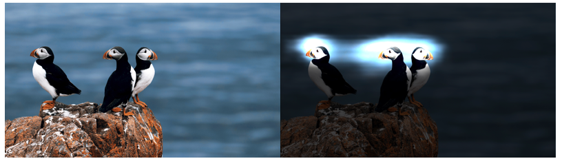当我们第一次看到左侧这张图片时,视线一定是最先被这三张鸟脸 (海雀脸) 吸引的。如果把注意力集中的地方,用高光在图片中标注出来,那么大概就是第二张图这样:高光集中于鸟的头部。