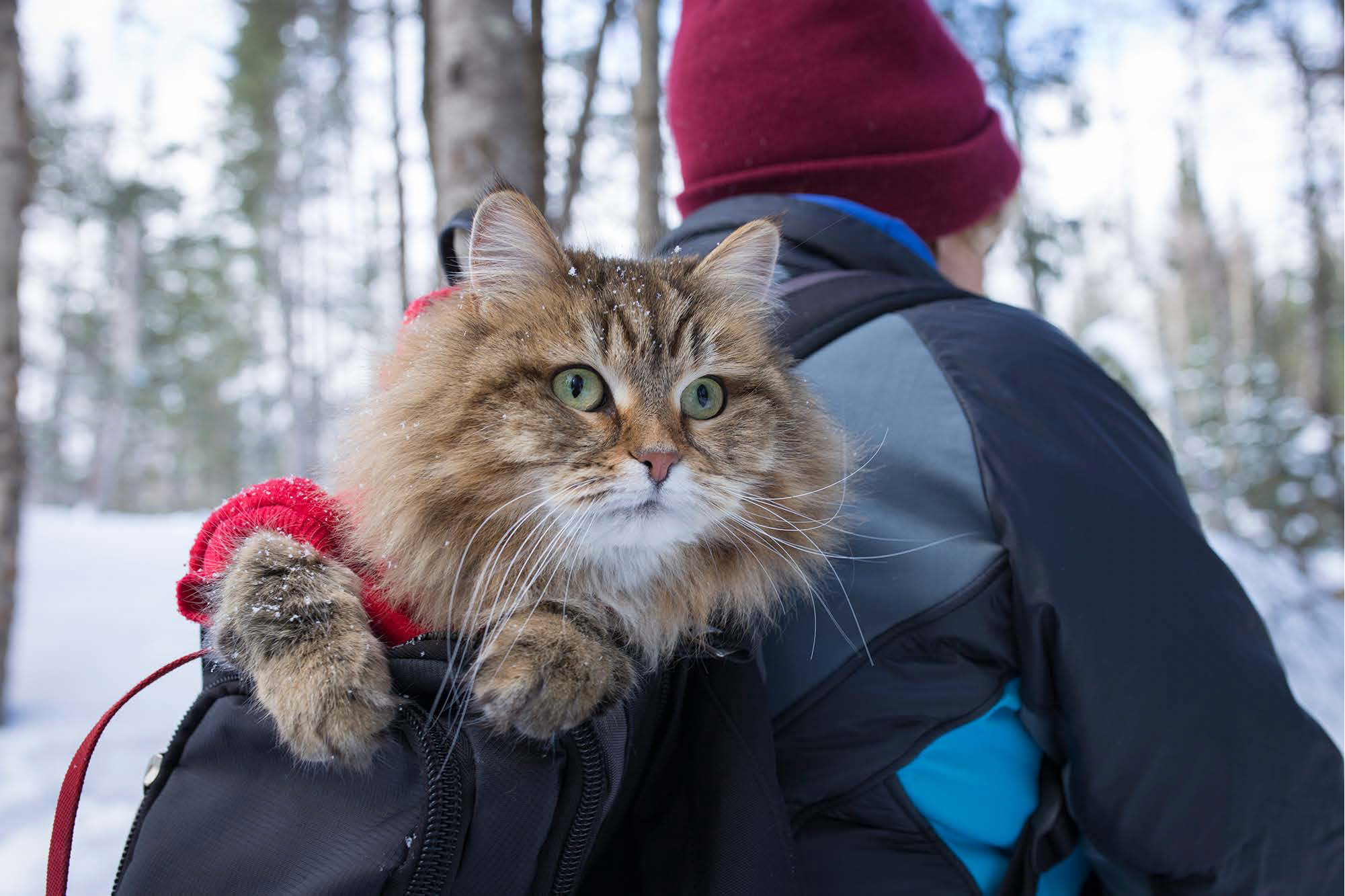 [(animal, 0.848), (cat, 0.848), (mammal, 0.848), (clothing, 0.676), (beanie, 0.675), (hat, 0.675), (people, 0.616), (adult, 0.616), (snow, 0.445), (jacket, 0.214), (outdoor, 0.063), (leash, 0.057), (cord, 0.057)......]