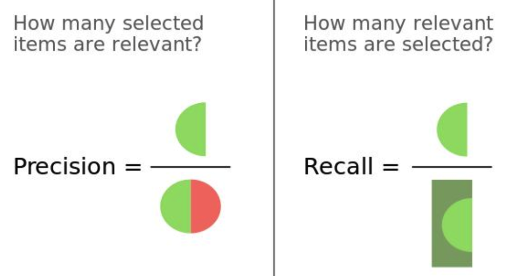 - Recall 召回率,指的是所有符合要求的结果中,被成功预测出来的比例。它反映的是漏报程度。Recall 率越高,代表预测的越准确,漏报数量越少。
