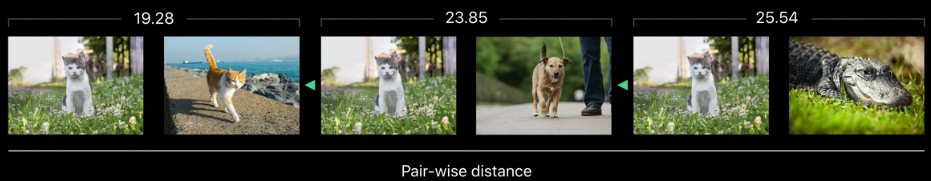 在得到了 FeaturePrint 之后,我们就可以直接比较图片间的相似程度。computeDistance(_:to:) 方法可以直接得到一个反映图片相似度的浮点数。比如下图中,数值越小,图片在语义 (semantic sense) 上越相似。