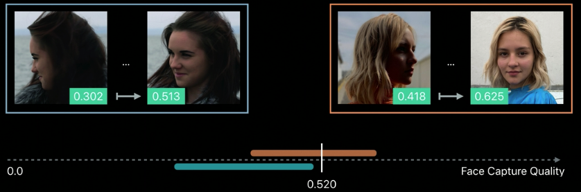 Face capture quality 是一个综合性指标,用于判定人像效果的好坏,衡量因素包含光线、模糊程度、是否有遮挡、表现力、人物姿态等等。