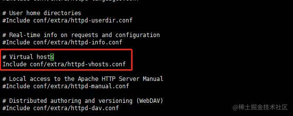 在配置文件中找到 Include conf/extra/httpd-vhosts.conf 下面这段,并将开头的 # 号删除,