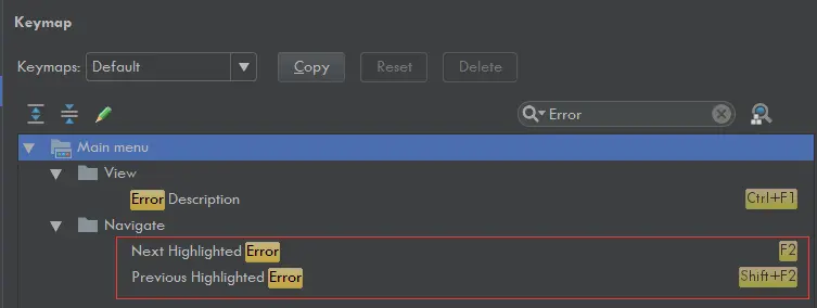 我在搜索框输入 Error,就找到了快速定位到错误位置的快捷键 F2 和 Shift+F2 可以快速的定位到错误行。
