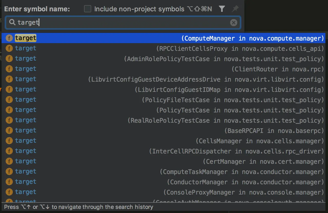 - 精准定位到符号:类的所有成员(函数、变量等)都可以称之为符号,Windows(Ctrl+Alt+Shift+N),Mac(Option+Shift+Command+N)