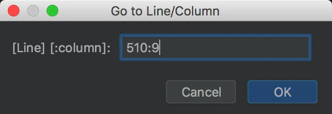 - 精准定位到某行:Windows(Ctrl+G),Mac(Command+G),如下图定位到第510行第9个字符处。