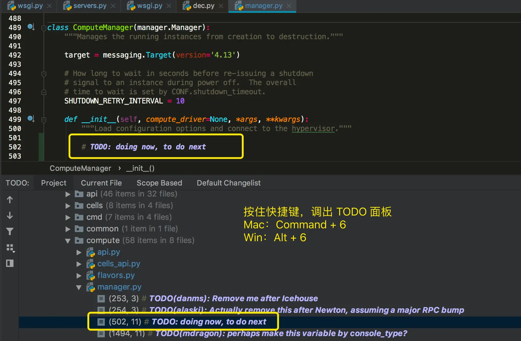 使用方法跟注释差不多,只要固定要以 TODO 开头。然后,你要查看全局项目中的所有 TODO 事项的时候,可以使用快捷键调出 TODO 面板。如果你是 Mac, 快捷键 是Command + 6,而 Windows 是 Alt+6。