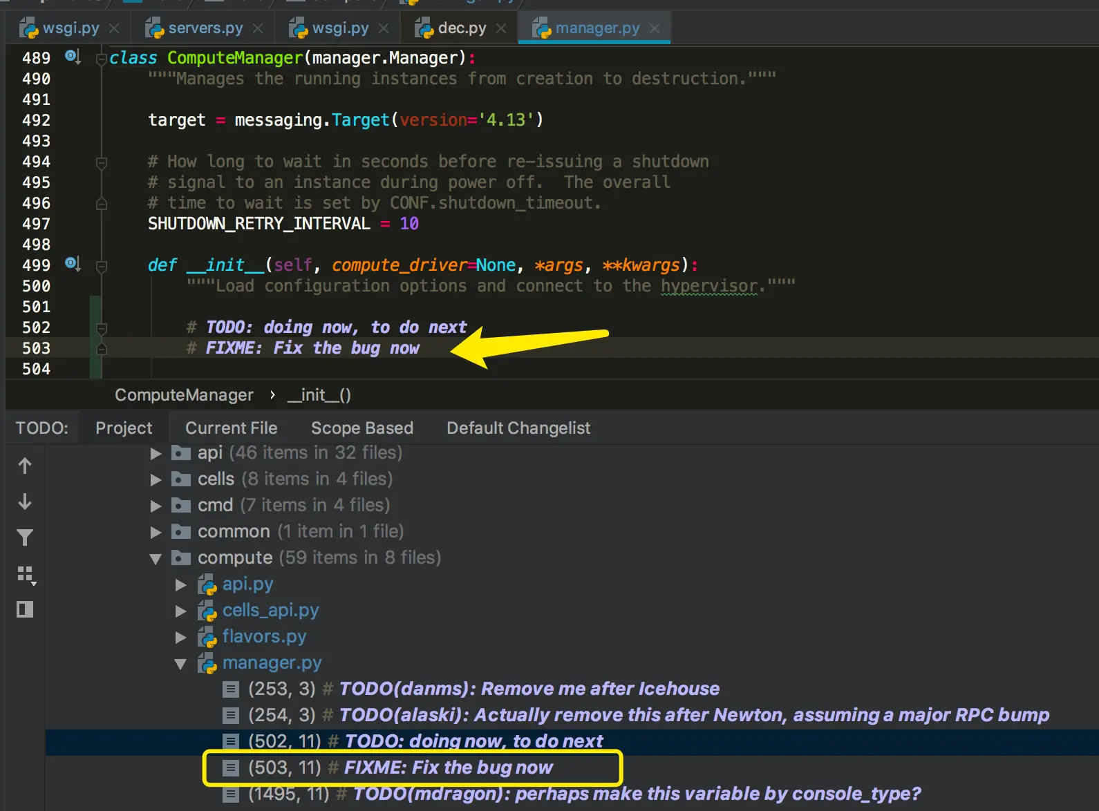 为了避免这个情况,我通常在别人打断我的时候,请对方给我一分钟的时间,使用PyCharn 的 TODO 功能快速记录下当前的思绪状态,以及下一步要做的事情。