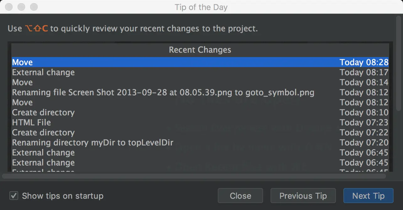 太巧的是,今天我打开 PyCharm ,就给我推了这条 tip,(在Mac上)使用 option+shift+C 可以快速查看最近修改的内容(windows 上应该是alt+shift+c吧)