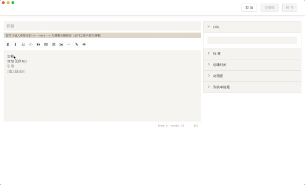 在写作界面的右边栏里,我们可以给文章命名一个好记的 URL、选定一个相关主题的标签、修改文章的创建时间或者给我们的文章配一个贴切的封面图。