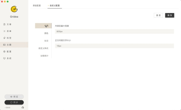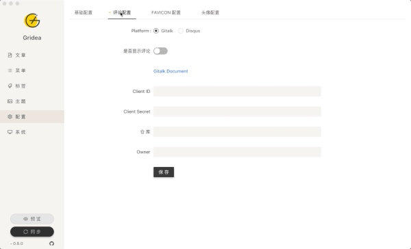 接下来我们可以自定义一些配置让博客的功能更完善和美观,在配置界面里,我们可以配置博客的评论系统,目前 Gridea 支持 Gitalk 和 Disqus,在这里就不详细介绍如果配置评论系统,有需求的同学可以查看作者给出的 小白教程,同样我们也可以修博客的 Favicon 和头像。