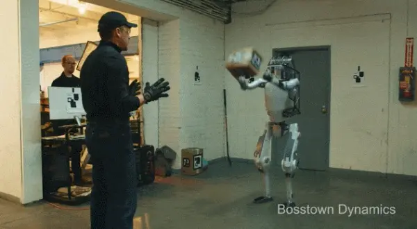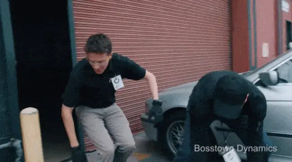 但刚过30秒,画风就变了,和波士顿动力测试机器人的手法一样,背后偷袭机器人!