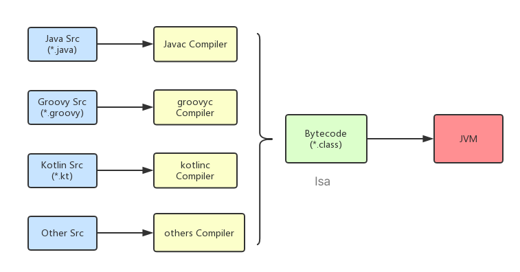 不单单是Java语言,其它语言也可以被它“翻译”过去。 代码进来,字节码出去~
