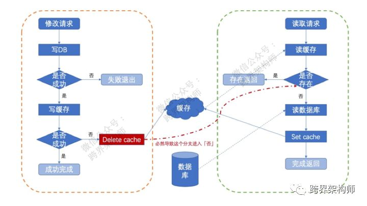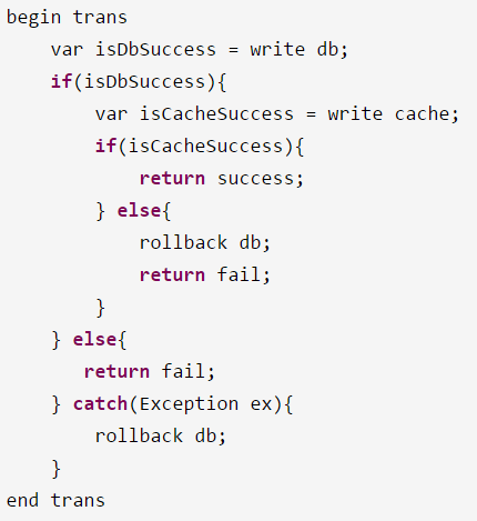 begin trans var isDbSuccess = write db; if(isDbSuccess){ var isCacheSuccess = delete cache; if(isCacheSuccess){ return success; } else{ rollback db; return fail; } } else{ return fail; } catch(Exception ex){ rollback db; }end trans//在这里做这个临时存储,{key,value,expire}。delete cache;如此一来,当「读数据」的时候发生cache miss,先判断是否存在这个临时数据,只要在3秒内就会强制走「主库」取数据。