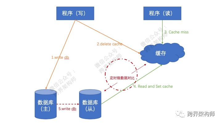 解决它的第一个方式很简单,也很粗暴。就是定时去「从库」读数据,发现数据和缓存不一样了就set到缓存里去。