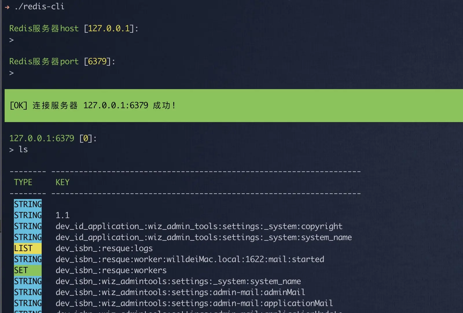 - 输入redis连接: host port (可以启用auth输入密码,如果有需要自己去src/RedisCommand.php -> connRedis() 修改 )