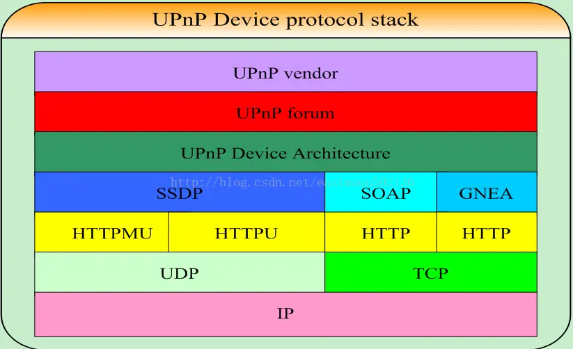 UPnP 是一个多层协议构成的框架体系,每一层都以相邻的下层为基础,同时又是相邻上层的基础。直至达到应用层为止。