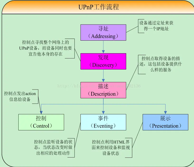 整个工作过程需要处理六个方面的内容,即地址分配、发现设备、对设备的描述、设备控制、设备事件、设备展示。