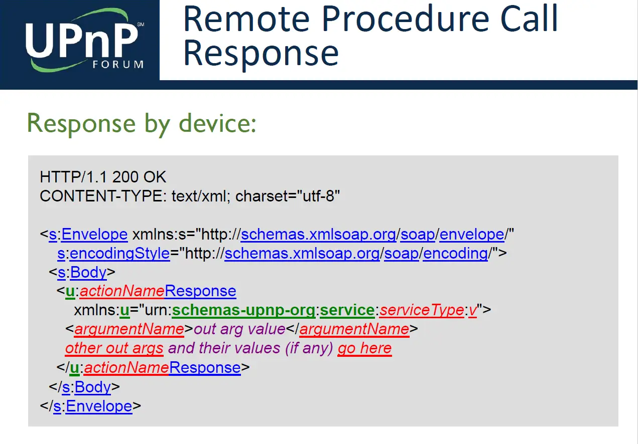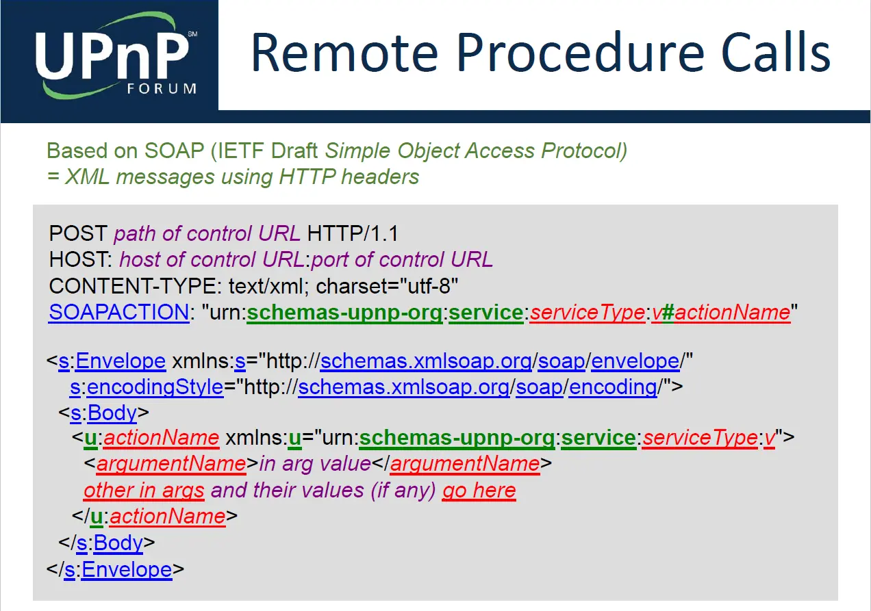 UPnP 使用SOAP完成控制。SOAP 工作在 HTTP 上,使用 XML 来描述远程调用并返回结果。