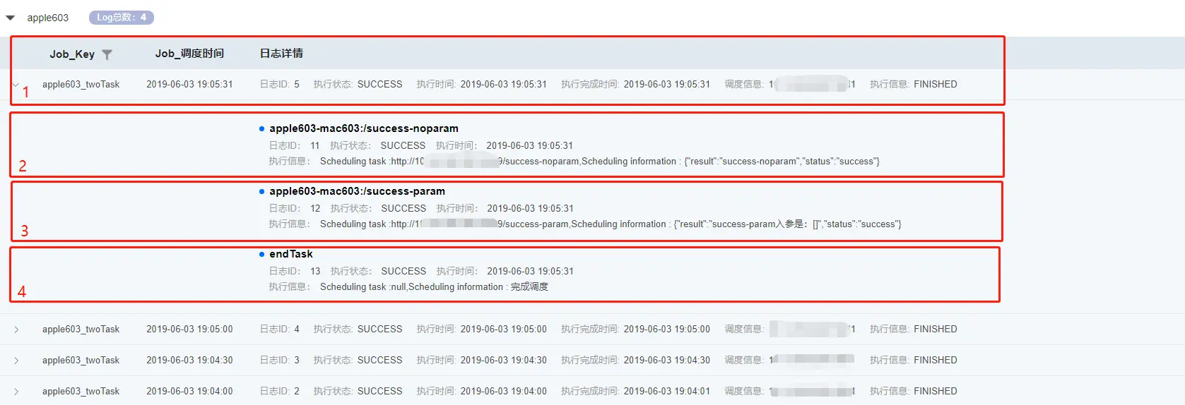 成功激活JOB后,进入调度日志界面,等待至JOB执行时间后,可查看到该JOB执行日志,如下图示。