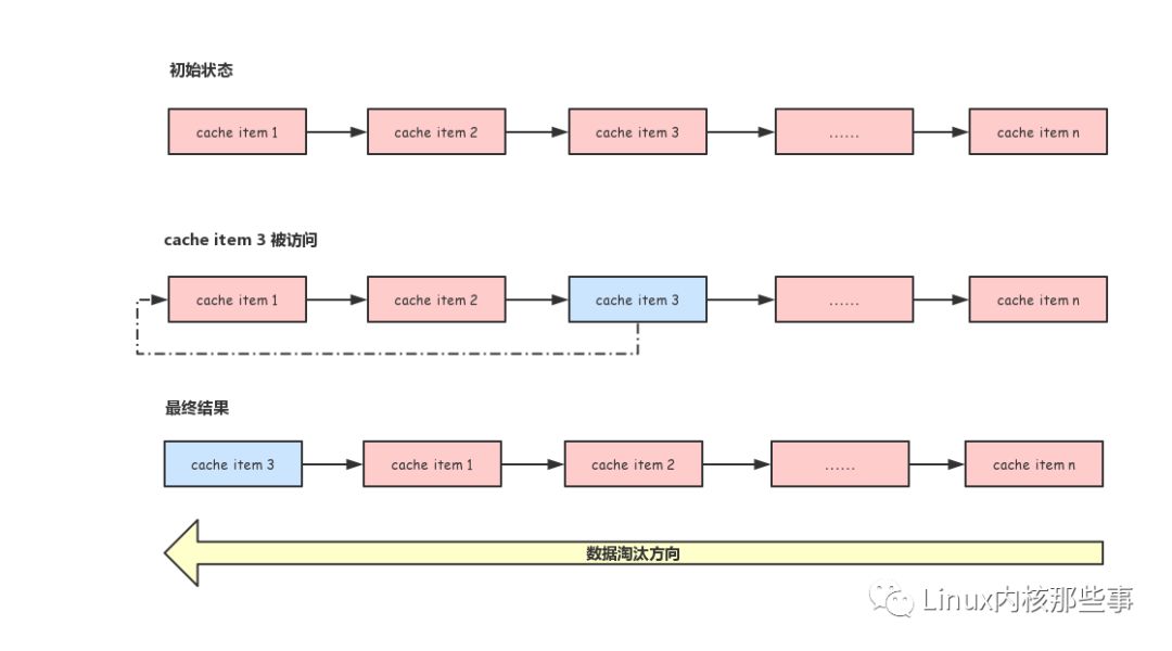 最简单的实现方式就是把所有缓存通过一个链表连接起来,新创建的缓存添加到链表的头部,如果有缓存被访问了,就把缓存移动到链表的头部。由于被访问的缓存会移动到链表的头部,所以没有被访问的缓存会随着时间的推移移动的链表的尾部,淘汰数据时只需要从链表的尾部开始即可。下图展示了这个过程:
