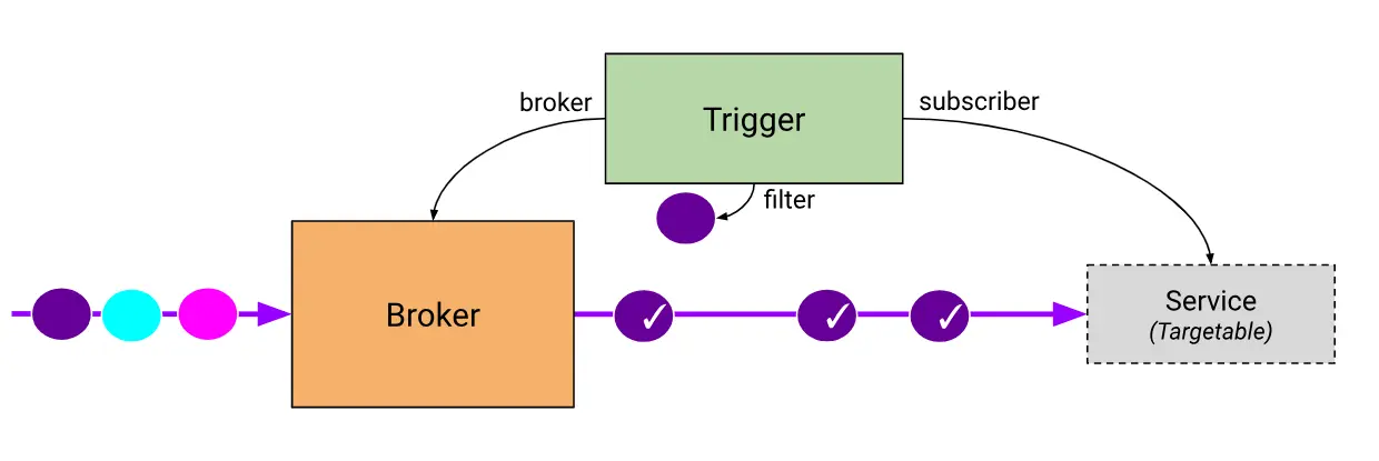 - Broker 提供一个事件集,可以通过属性选择该事件集。它负责接收事件并将其转发给由一个或多个匹配 Trigger 定义的订阅者。