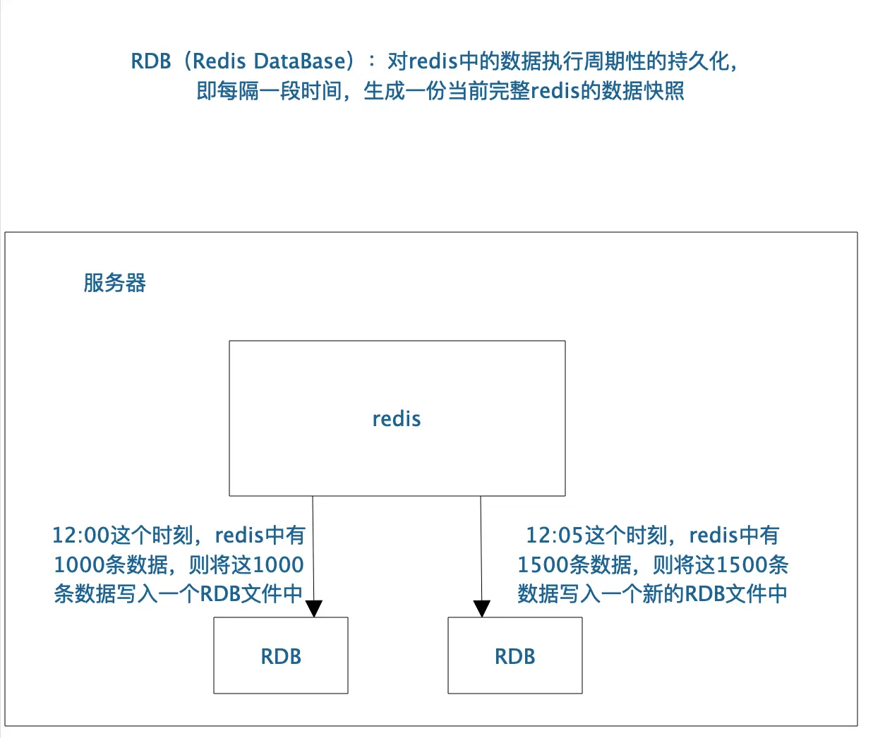 - RDB(Redis DataBase):对redis中的数据执行周期性的持久化,即每隔一段时间,生成一份当前完整redis的数据快照: