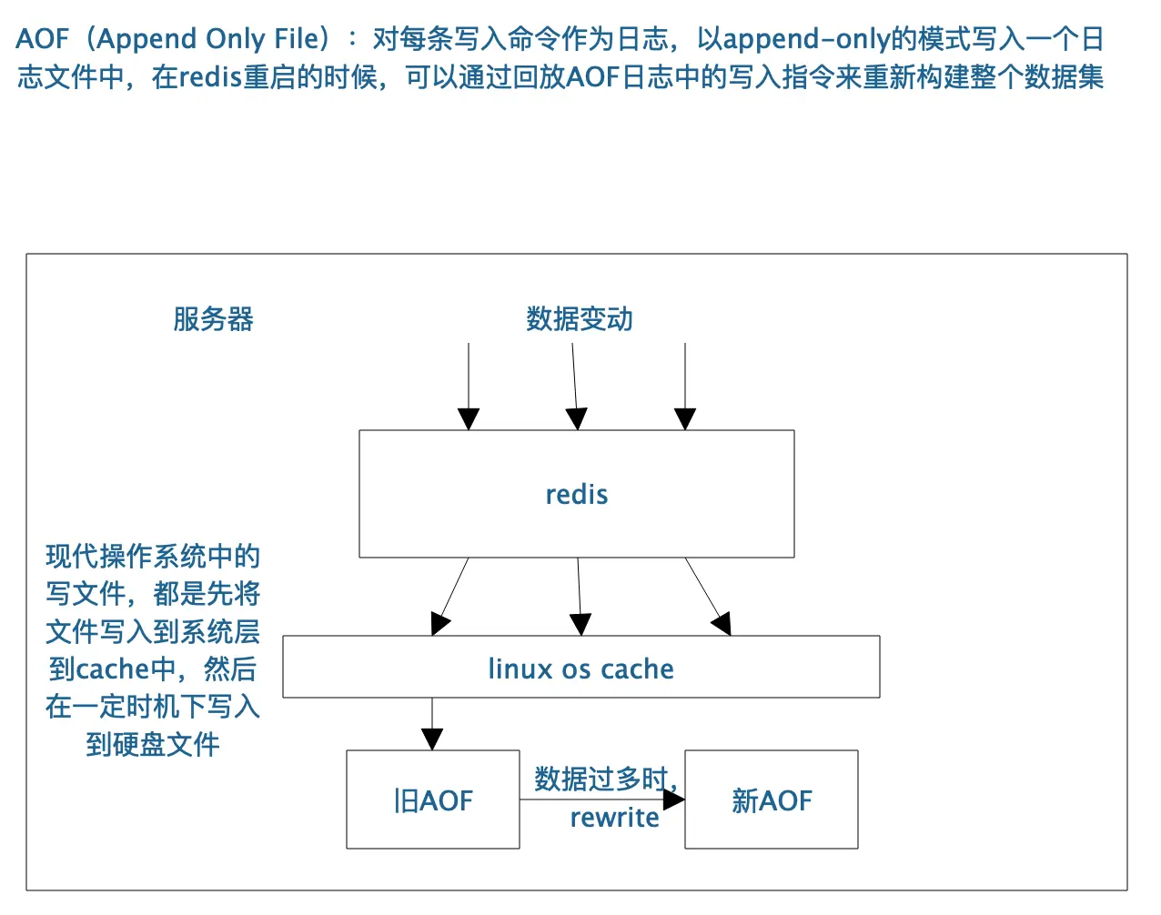 - AOF(Append Only File):对每条写入命令作为日志,以append-only的模式写入一个日志文件中,在redis重启的时候,可以通过回放AOF日志中的写入指令来重新构建整个数据集