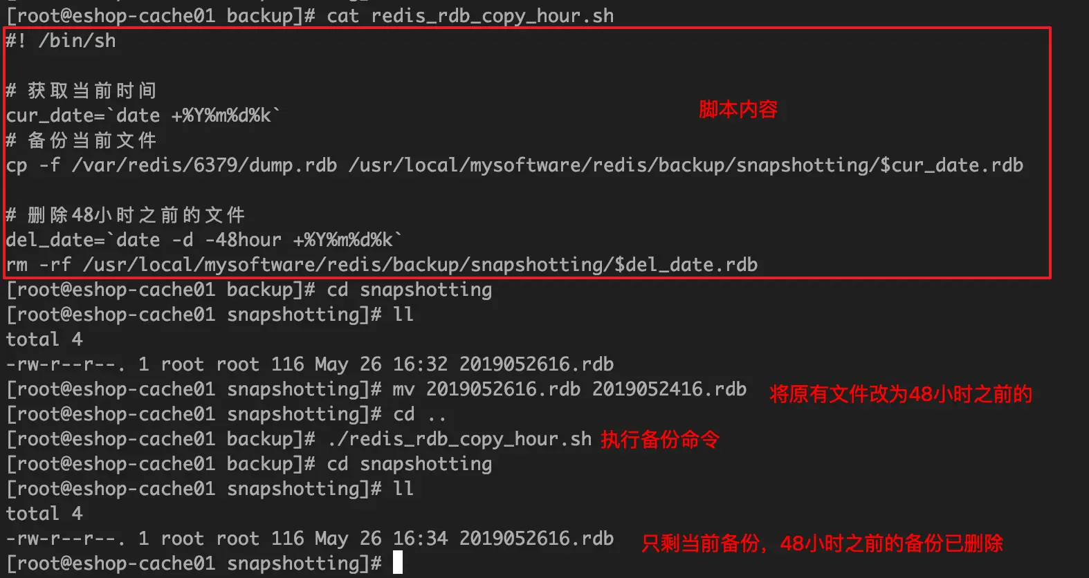 #!/bin/sh cur_date=`date +%Y%m%d` cp /var/redis/6379/dump.rdb /usr/local/redis/snapshotting/$cur_date.rdb del_date=`date -d -1month +%Y%m%d` rm -rf /usr/local/redis/snapshotting/$del_date.rdb - 每次copy备份的时候,都把太旧的备份给删了(通常删除 48小时 或者 1个月 之前的数据)