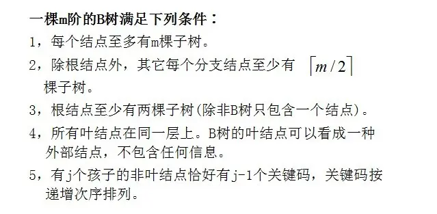 每个非根的内结点至多有m个子女,每个非根的结点必须至少含有m-1个关键字,如果树是非空的,则根结点至少包含一个关键字;