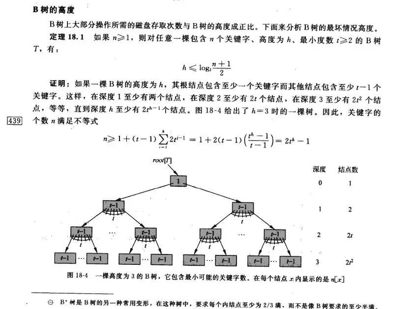 此外,还有读者反馈,说上面的B树的高度计算公式与算法导论一书上的不同,而后我特意翻看了算法导论第18章关于B树的高度一节的内容,如下图所示: