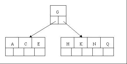 2、当咱们试着插入H时,结点发现空间不够,以致将其分裂成2个结点,移动中间元素G上移到新的根结点中,在实现过程中,咱们把A和C留在当前结点中,而H和N放置新的其右邻居结点中。如下图: