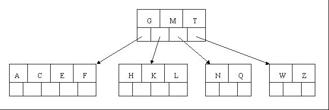相信,从上图你能轻易的看到,一个内结点x若含有n[x]个关键字,那么x将含有n[x]+1个子女。如含有2个关键字D H的内结点有3个子女,而含有3个关键字Q T X的内结点有4个子女。